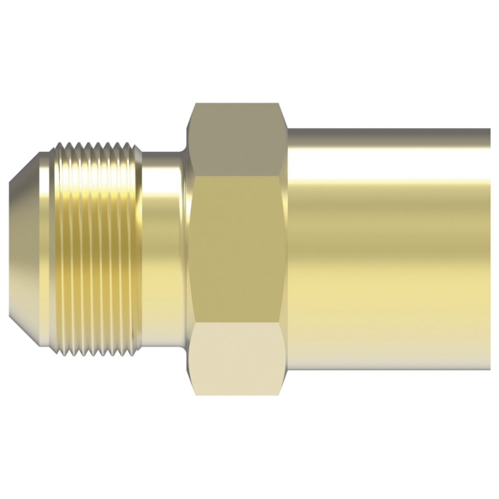 Aeroquip® Straight Connector, 46x Series, Connection Type 1: SAE 45 deg Flare, Gender 1: Male, Connection Size 1: 1/4 in, Connection Type 2: NPTF, Gender 2: Female, Connection Size 2: 1/4 in, Thread Size 2: 1/4-18, Hex Size: 11/16 in, Brass, Finish: Nickel-Plated, Dimensions: 1-1/4 in L x 3/4 in W x 3/4 in H, Dimension Standards: SAE 010103