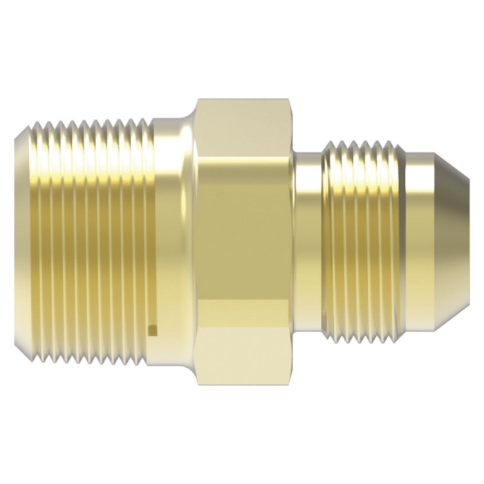 Aeroquip® Straight Connector, 48x Series, Connection Type 1: SAE 45 deg Flare, Gender 1: Male, Connection Size 1: 1/4 in, Thread Size 1: 1/8-27, Connection Type 2: NPTF, Gender 2: Male, Connection Size 2: 1/8 in, Thread Size 2: 1/8-27, Hex Size: 0.437 in, 2000 psi, Brass, Finish: Nickel-Plated, Dimensions: 1.06 in L x 0.437 in W x 0.437 in H, Dimension Standards: SAE 010102, -65 to 250 deg F