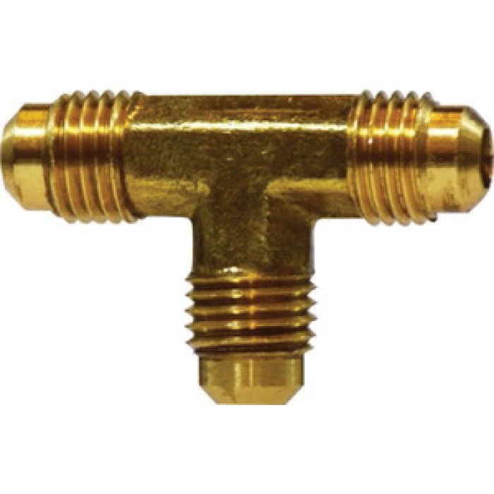 Midland Metals Union Tee, Connection Type 1: SAE 45 deg Flare, Gender 1: Male, Connection Size 1: 1/4 in, Thread Size 1: 7/16-20, Connection Type 2: SAE 45 deg Flare, Gender 2: Male, Connection Size 2: 1/4 in, Thread Size 2: 7/16-20, Connection Type 3: SAE 45 deg Flare, Gender 3: Male, Connection Size 3: 1/4 in, Thread Size 3: 7/16-20, 1400 psi, Forged Brass, For Use With: Copper, Brass, Aluminum and Steel Hydraulic Tubing that can be Flared, Dimensions: 1.56 in L, Dimension Standards: SAE 010401, -65 to 250 deg F