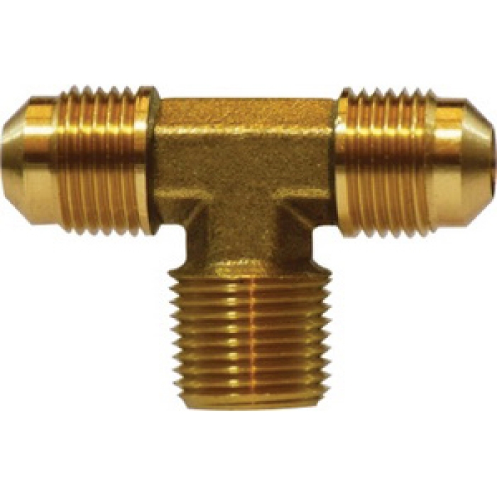 Midland Metals Branch Tee, Connection Type 1: SAE 45 deg Flare, Gender 1: Male, Connection Size 1: 3/8 in, Thread Size 1: 5/8-18, Connection Type 2: SAE 45 deg Flare, Gender 2: Male, Connection Size 2: 3/8 in, Thread Size 2: 5/8-18, Connection Type 3: NPT, Gender 3: Male, Connection Size 3: 1/4 in, 1000 psi, Forged Brass, For Use With: Copper, Brass, Aluminum and Steel Hydraulic Tubing that can be Flared, Dimensions: 2 in L, Dimension Standards: SAE 010425, -65 to 250 deg F