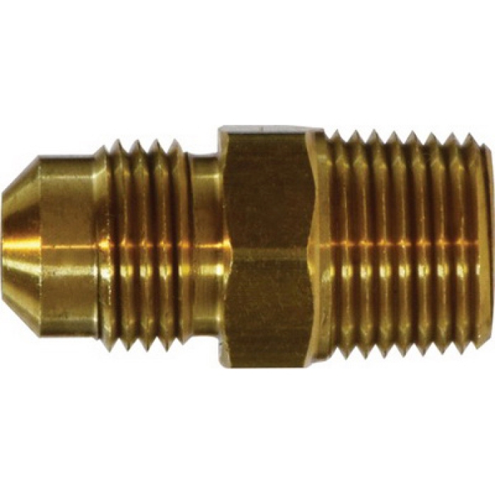 Midland Metals Straight Adapter, Connection Type 1: SAE 45 deg Flare, Gender 1: Male, Connection Size 1: 5/16 in, Thread Size 1: 1/2-20, Connection Type 2: NPTF, Gender 2: Male, Connection Size 2: 3/8 in, Thread Size 2: 3/8-18, Hex Size: 0.68 in, 1200 psi, Brass, For Use With: Copper, Brass, Aluminum and Steel Hydraulic Tubing that can be Flared, Dimensions: 1.38 in L, Dimension Standards: SAE 010102, -65 to 250 deg F