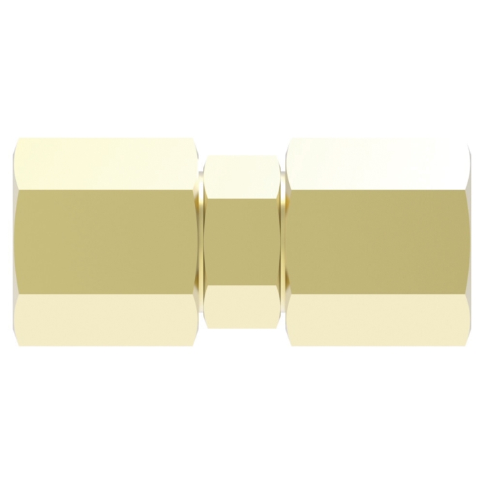 Aeroquip® Straight Union, 62x Series, Connection Type 1: Compression, Gender 1: Female, Connection Size 1: 1/8 in, Thread Size 1: 5/16-24, Connection Type 2: Compression, Gender 2: Female, Connection Size 2: 1/8 in, Thread Size 2: 5/16-24, Hex Size: 0.312 x 0.375 in, 2000 psi, Brass, Dimensions: 1.04 in L x 0.375 in W x 0.375 in H, Dimension Standards: SAE 060101BA, -65 to 250 deg F