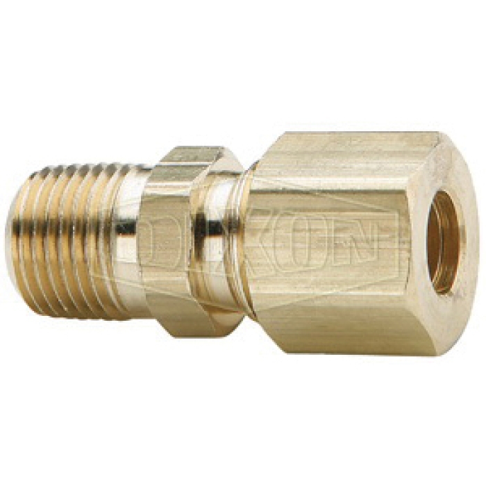 Dixon® Connector, Connection Type 1: Compression, Connection Size 1: 1/2 in, Thread Size 1: 11/16-20, Connection Type 2: Threaded, Gender 2: Male, Connection Size 2: 1/2 in, Hex Size: 7/8 in, 200 psi, Brass, For Use With: Copper, Aluminum and Thermoplastic Tubing, Low and Medium Pressure Tubing Connection, Dimensions: 1.71 in L, Dimension Standards: SAE J512, SAE 060102 BA, -65 to 250 deg F