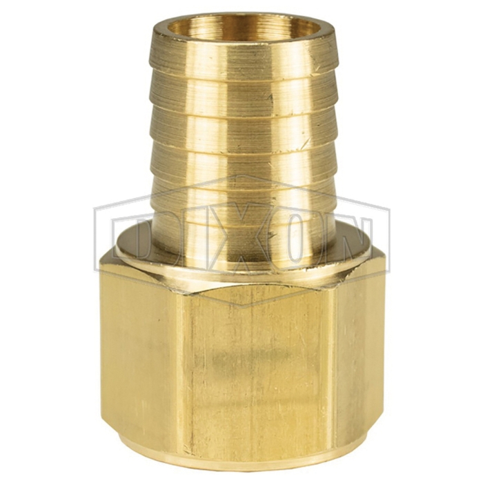 Dixon® Hose Barb, Connection Type 1: Hose Barb, Connection Size 1: 1 in, Connection Type 2: NPTF, Gender 2: Female, Connection Size 2: 1 in, Hex Size: 1-7/16 in, Brass, For Use With: Hose Clamps or Crimped Ferrules, Dimensions: 2.32 in L