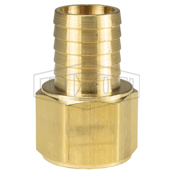 Dixon® Hose Barb, Connection Type 1: Hose Barb, Connection Size 1: 1-1/4 in, Connection Type 2: NPTF, Gender 2: Female, Connection Size 2: 1 in, Thread Size 2: 1-11-1/2, Hex Size: 1-7/16 in, Brass, For Use With: Hose Clamps or Crimped Ferrules, Dimensions: 2.32 in L