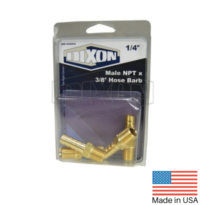 Dixon® Retail Packaged Hose Barb, Connection Type 1: Hose Barb, Connection Size 1: 3/8 in, Connection Type 2: NPTF, Gender 2: Male, Connection Size 2: 1/4 in, Hex Size: 9/16 in, Brass, For Use With: Hose Clamps or Crimped Ferrules, Dimensions: 1.76 in L