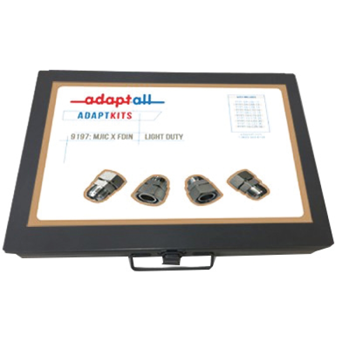 The 9197 light kit is a convenient mix of male JIC x female DIN DKO sizes to keep on hand for a variety of applications: you can either sell the entire kit, a few fittings at a time, or use them in your shop or retail environment as a fitting identification tool. Comes in durable metal case and fully labeled for convenience.