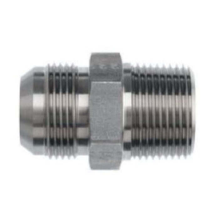 Brennan Straight Adapter, Series: 2404, Connection Type 1: SAE 37 deg JIC Flare, Gender 1: Male, Connection Size 1: 3/8 in, Thread Size 1: 9/16-18, Connection Type 2: NPTF, Gender 2: Male, Connection Size 2: 1/2 in, Thread Size 2: 1/2-14, Hex Size: 7/8 in, 6000 psi, Steel, 1.69 in Length, Dimension Standards: MS 51500, SAE 070102