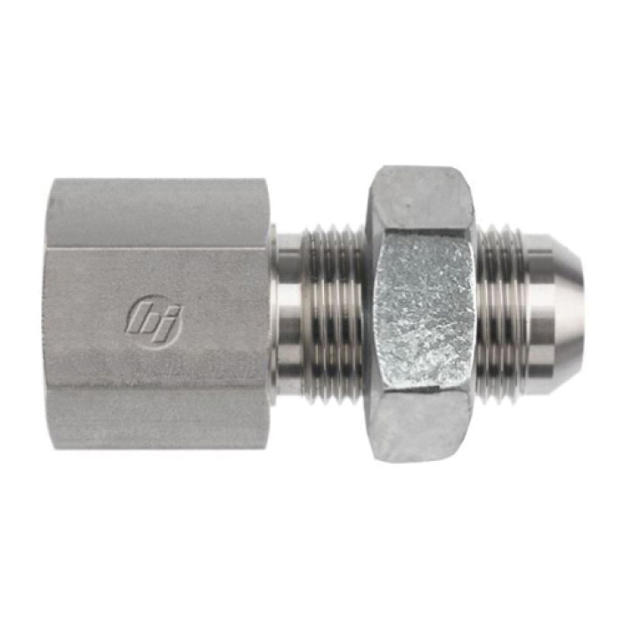 Brennan Bulkhead Straight Adapter with Locknut, Series: 2705-LN, Connection Type 1: SAE 37 deg JIC Flare, Gender 1: Male, Connection Size 1: 3/8 in, Thread Size 1: 9/16-18, Connection Type 2: NPTF, Gender 2: Female, Connection Size 2: 1/2 in, Thread Size 2: 1/2-14, Steel
