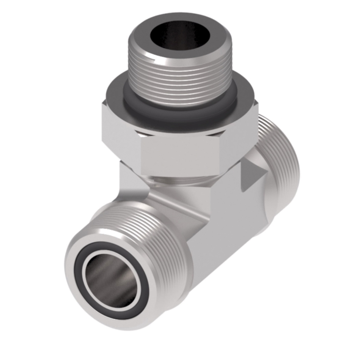 Aeroquip® FF1861T Dura-Kote Carbon Steel Tee, Connection Size 1: 1/2 in, Gender 1: Male, Connection Type 1: O-Ring Face Seal x Connection Size 2: 1/2 in, Gender 2: Male, Connection Type 2: O-Ring Face Seal x Connection Size 3: 1/2 in, Gender 3: Male, Connection Type 3: O-Ring Boss, -65 to 400 deg F