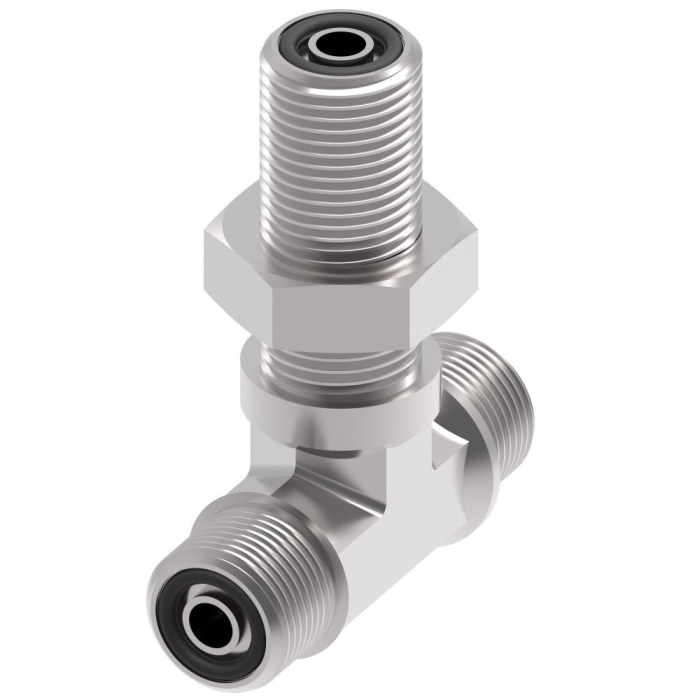 Aeroquip® FF2033T Dura-Kote Carbon Steel Tee, Connection Size 1: 1/2 in, Gender 1: Male, Connection Type 1: O-Ring Face Seal x Connection Size 2: 1/2 in, Gender 2: Male, Connection Type 2: O-Ring Face Seal x Connection Size 3: 1/2 in, Gender 3: Male, Connection Type 3: O-Ring Face Seal, -65 to 400 deg F