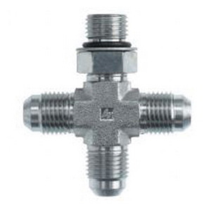 Brennan 6850 Forged Steel Cross, Connection Size 1: 3/8 in, Gender 1: Male, Connection Type 1: O-Ring Boss x Connection Size 2: 3/8 in, Gender 2: Male, Connection Type 2: JIC x Connection Size 3: 3/8 in, Gender 3: Male, Connection Type 3: JIC x Gender 4: Male, Connection Type 4: JIC, Connection 4: 3/8 in JIC