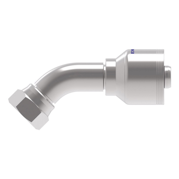 Aeroquip® 4-Spiral Crimp Hose 45 deg Elbow, 4S Series, Hose Connection: 1 in, Connection Type 1: Hose, Connection Size 1: 1 in, Hose Dash Size: 16, Connection Type 2: BSPP 60 deg Cone Seat 30 deg Swivel, Gender 2: Female, Connection Size 2: 1 in, Nominal Size: 1 in, Thread Size 2: G 1-11, Hex Size: 41 mm, Cut-Off Factor: 3.57 in, Carbon Steel, Finish: Dura-Kote, For Use With: EC525-12 to -32, GH493-12 to -32, FC636-12 to -32, FC736-12 to -32, FC500-12 to -24, FC273B-12 and -16, GH506-12 to -32, FC254-12 to -32, EC810-12 and -16, EC600-12 and -16, H430-12 to -32, H430R-12 to -32, EC525-12 to -32, H471-12 to -24, H464-12 to -32, and H485-16 Hoses, Dimensions: 5.13 in L x 2.084 in W x 1.18 in H, Dimension Standards: SAE J1176