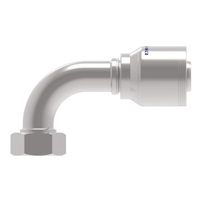 Aeroquip® 4-Spiral Crimp Hose 90 deg Elbow, 4S Series, Hose Connection: 1-1/4 in, Connection Type 1: Hose, Connection Size 1: 1-1/4 in, Hose Dash Size: 20, Connection Type 2: DIN Light 24 deg Seat Swivel, Gender 2: Female, Connection Size 2: 36 mm, Nominal Size: 36 in, Thread Size 2: M45 x 2, Hex Size: 50 mm, Cut-Off Factor: 3.9 in, Carbon Steel, Finish: Dura-Kote, For Use With: EC525-12 to -32, GH493-12 to FC636-12 to -32, FC736-12 to -32, FC500-12 to -24, FC273B-12, -16, GH506-12 to -32, FC254-12 to -32, EC810-12, -16, EC600-12, -16 H430-12 to -32, H430R-12 to -32, EC525-12 to -32, H471-12 to -24, H464-12 to -32, and H485-16 Series Hoses, Dimensions: 6.07 in L x 2.457 in W x 3.11 in H, Dimension Standards: SAE J1176