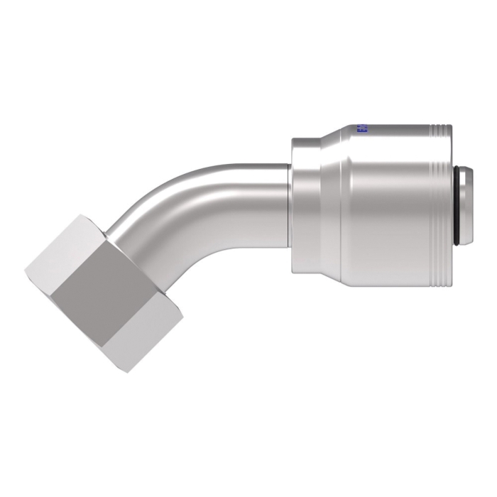 Aeroquip® 4-Spiral Crimp Hose 45 deg Elbow, 4S Series, Hose Connection: 1 in, Connection Type 1: Hose, Connection Size 1: 1 in, Hose Dash Size: 16, Connection Type 2: ORFS Swivel, Gender 2: Female, Connection Size 2: 1-1/4 in, Nominal Size: 1-1/4 in, Thread Size 2: 1-11/16-12, Hex Size: 1-7/8 in, Cut-Off Factor: 3.82 in, Carbon Steel, Finish: Dura-Kote, For Use With: EC525-12 to -32, GH493-12 to -32, FC636-12 to -32, FC736-12 to -32, FC500-12 to -24, FC273B-12 and -16, GH506-12 to -32, FC254-12 to -32, EC810-12 and -16, EC600-12 and -16, H430-12 to -32, H430R-12 to -32, EC525-12 to -32, H471-12 to -24, H464-12 to -32, and H485-16 Hoses, Dimensions: 5.38 in L x 2.084 in W x 1.22 in H, Dimension Standards: SAE J1176
