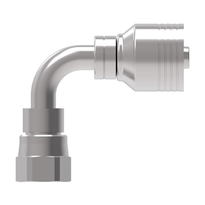 Aeroquip® 4-Spiral Crimp Hose 90 deg Elbow, 4S Series, Hose Connection: 1/2 in, Connection Type 1: Hose, Connection Size 1: 1/2 in, Hose Dash Size: 08, Connection Type 2: SAE 37 deg JIC Swivel, Gender 2: Female, Connection Size 2: 5/8 in, Nominal Size: 5/8 in, Thread Size 2: 7/8-14, Hex Size: 1 in, Cut-Off Factor: 1.7 in, Carbon Steel, Finish: Dura-Kote, For Use With: EC525-12 to -32, GH493-12 to -32, FC636-12 to -32, FC736-12 to -32, FC500-12 to -24, FC273B-12 and -16, GH506-12 to -32, FC254-12 to -32, EC810-12 and -16, EC600-12 and -16, H430-12 to -32, H430R-12 to -32, EC525-12 to -32, H471-12 to -24, H464-12 to -32, and H485-16 Hoses, Dimensions: 2.87 in L x 1.335 in W x 3.117 in H, Dimension Standards: SAE J1176