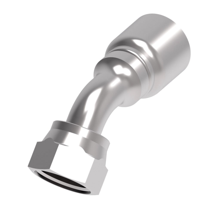 Aeroquip® Crimp Hose 45 deg Elbow, 1G Series, Hose Connection: 3/4 in, Connection Type 1: Hose, Connection Size 1: 3/4 in, Hose Dash Size: 12, Connection Type 2: ORFS Swivel, Gender 2: Female, Connection Size 2: 3/4 in, Nominal Size: 3/4 in, Thread Size 2: 1 3/16-12, Hex Size: 1-3/8 in, Cut-Off Factor: 2.38 in, Carbon Steel, Finish: Dura-Kote, For Use With: 2583, 2661, FC318, FC466, FC498, FC598, FC619, and FC699 Series Hoses, Dimensions: 4.81 in L x 1.59 in W x 2.49 in H