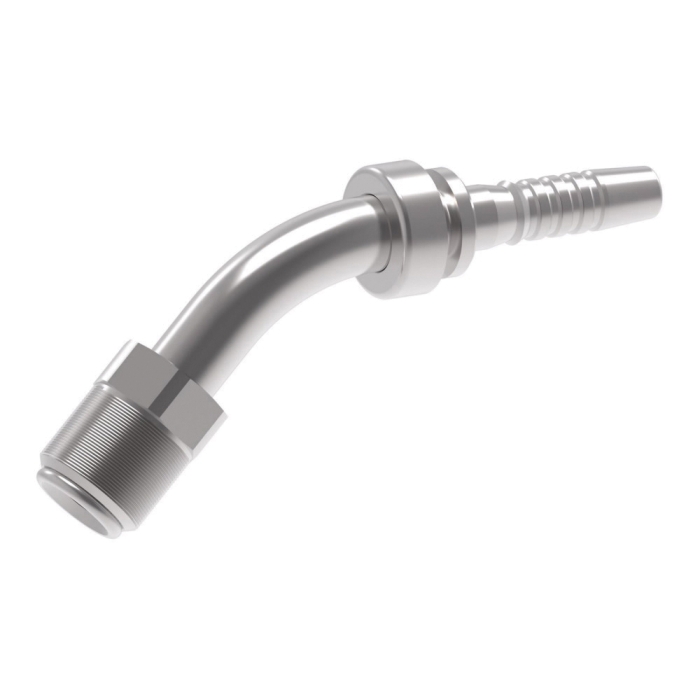 Aeroquip® Crimp Hose 45 deg Nipple, FC6261 Series, Hose Connection: 1/4 in, Connection Type 1: Hose, Connection Size 1: 1/4 in, Hose Dash Size: 04, Connection Type 2: SAE Inverted Flare, Gender 2: Male, Connection Size 2: 1/4 in, Carbon Steel, For Use With: FC807 PTFE Hoses