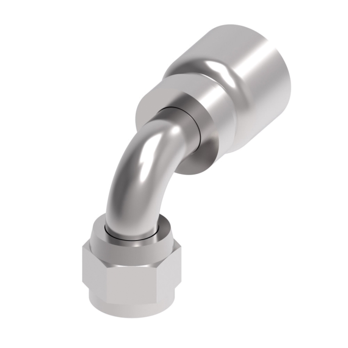 Aeroquip® 100R5 Crimp Hose 90 deg Elbow, FJ3244 Series, Hose Connection: 1/4 in, Connection Type 1: Hose, Connection Size 1: 1/4 in, Hose Dash Size: 04, Connection Type 2: SAE 45 deg/37 deg JIC Swivel, Gender 2: Female, Connection Size 2: 1/4 in, Nominal Size: 1/4 in, Thread Size 2: 7/16-20, Hex Size: 0.5625 in, Cut-Off Factor: 0.83 in, Carbon Steel, Finish: Dura-Kote, For Use With: 1503, FC234, FC300, FC350, and FC355 Series Hoses, Dimensions: 1.89 in L x 0.67 in W x 1.34 in H