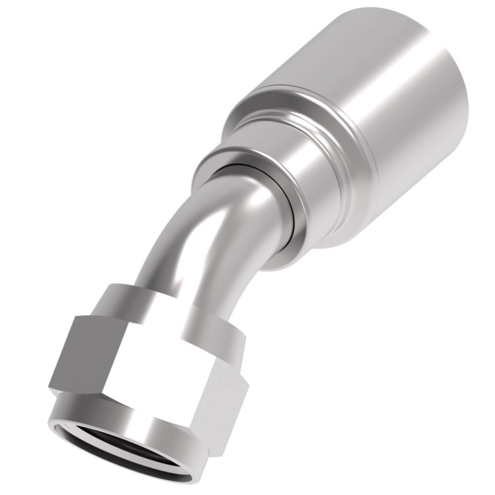 Aeroquip® Crimp Hose 45 deg Elbow, 4T Series, Hose Connection: 3/8 in, Connection Type 1: Hose, Connection Size 1: 3/8 in, Hose Dash Size: 06, Connection Type 2: 37 deg JIC Swivel, Gender 2: Female, Connection Size 2: 3/8 in, Nominal Size: 3/8 in, Thread Size 2: 9/16-18, Hex Size: 0.6875 in, Cut-Off Factor: 1.31 in, Carbon Steel, For Use With: Thermoplastic Hoses, Dimensions: 2.65 in L x 0.962 in W x 1.214 in H
