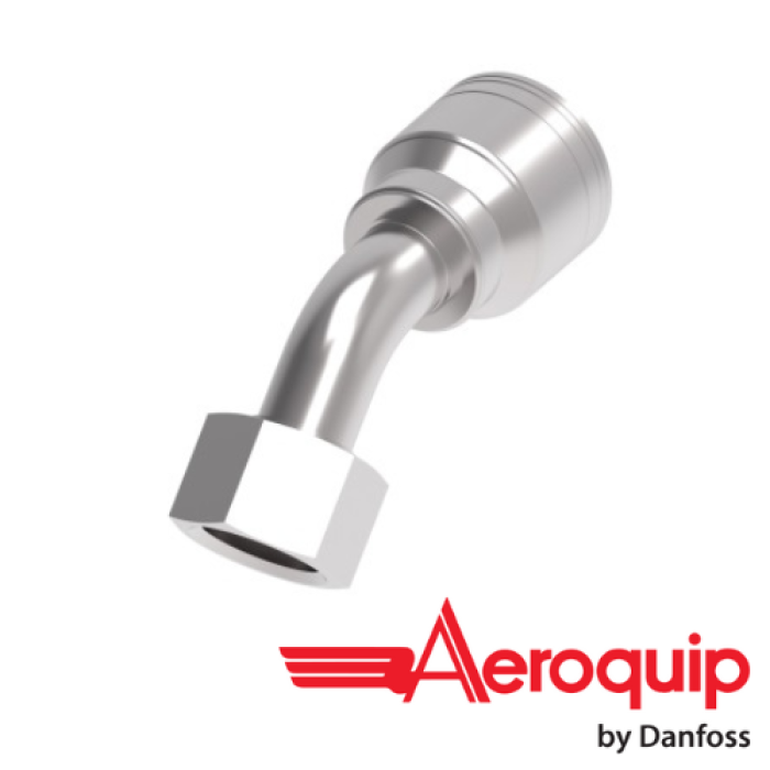Aeroquip® Crimp Hose 45 deg Elbow, 1A Series, Hose Connection: 1/4 in, Connection Type 1: Hose, Gender 1: Female, Connection Size 1: 1/4 in, Hose Dash Size: 04, Connection Type 2: JIS/BSPP 60 deg Cone Swivel, Gender 2: Female, Connection Size 2: 1/4 in, Nominal Size: 1/4 in, Thread Size 2: G 1/4-19, Hex Size: 0.66 in, Cut-Off Factor: 1.65 in, Carbon Steel, Finish: Dura-Kote, For Use With: 2661 (-12 thru -32), FC310, FC510, FC579, FC611, FC619 (-12 thru -32), FC639/FC839B, FC693, FC735, FC849/FC849B, GH120, GH194, GH195, GH663, GH681-6, GH781, GH793, EC115, EC215, EC110, EC210, and EC118 Series Hoses, Dimensions: 3.08 in L x 0.882 in W x 1.6 in H