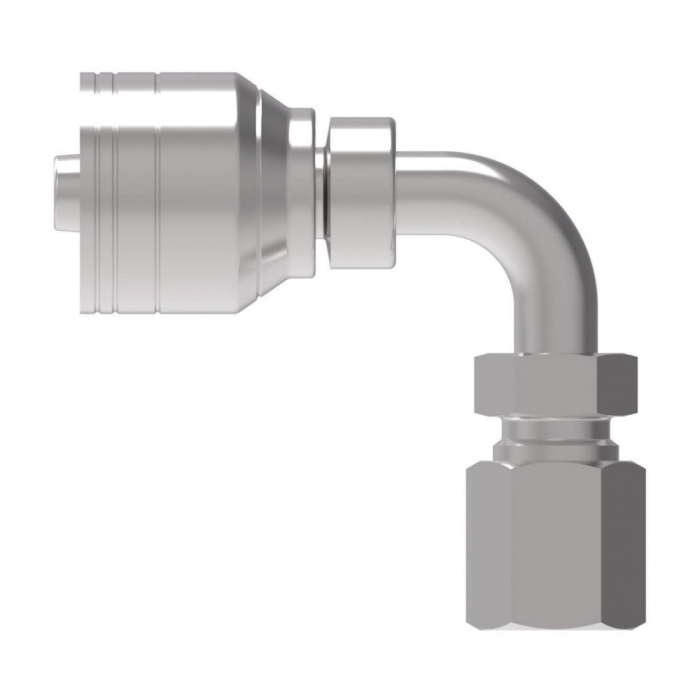 Aeroquip® Ermeto® 7000 Rigid Crimp Hose 90 deg Elbow, 1A Series, Hose Connection: 3/8 in, Connection Type 1: Hose, Connection Size 1: 3/8 in, Hose Dash Size: 06, Connection Type 2: Flareless Tube, Gender 2: Female, Connection Size 2: 3/8 in, Nominal Size: 3/8 in, Thread Size 2: 9/16-18, Hex Size: 0.6875 x 0.625 in, Cut-Off Factor: 1.22 in, Carbon Steel, Finish: Dura-Kote, For Use With: 2661 (-12 thru -32), FC310, FC510, FC579, FC611, FC619 (-12 thru -32), FC639/FC839B, FC693, FC735, FC849/FC849B, GH120, GH194, GH195, GH663, GH681-6, GH781, GH793, EC115, EC215, EC110, EC210, and EC118 Series Hoses, Dimensions: 2.55 in L x 1.067 in W x 2.49 in H