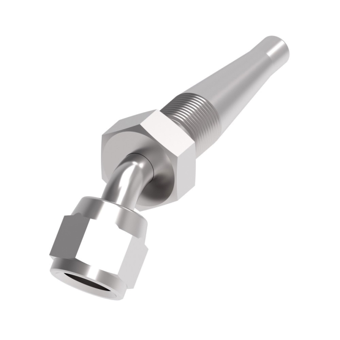 Aeroquip® Reusable 45 deg Elbow, 185297 Series, Hose Connection: 1/4 in, Connection Type 1: Hose, Connection Size 1: 1/4 in, Hose Dash Size: 04, Connection Type 2: SAE 45 deg/37 deg JIC Swivel, Gender 2: Female, Connection Size 2: 1/4 in, Nominal Size: 1/4 in, Thread Size 2: 7/16-20, Hex Size: 0.38 x 0.5625 in, Cut-Off Factor: 0.731 in, Carbon Steel, Finish: Dura-Kote, For Use With: 1503 Series Hoses, Dimensions: 2.07 in L x 0.5625 in W x 0.79 in H