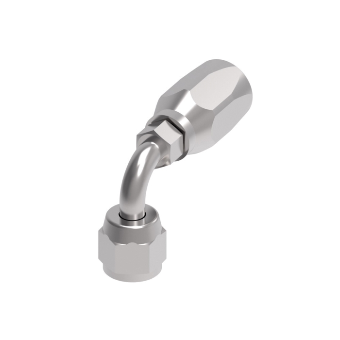 Aeroquip® 100R5 Reusable 90 deg Short Elbow, 190302 Series, Hose Connection: 3/8 in, Connection Type 1: Hose, Connection Size 1: 3/8 in, Hose Dash Size: 06, Connection Type 2: SAE 45 deg Swivel, Gender 2: Female, Connection Size 2: 3/8 in, Nominal Size: 3/8 in, Thread Size 2: 5/8-18, Hex Size: 0.75 x 0.81 in, Cut-Off Factor: 1.23 in, Carbon Steel, Finish: Dura-Kote, For Use With: 1503, 2580, 2651, FC234, FC300, FC321, FC350, FC355, and FC802 Series Hoses, Dimensions: 2.5 in L x 0.81 in W x 1.68 in H