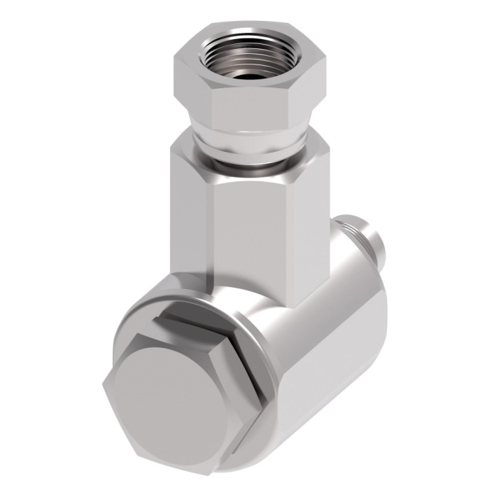 Aeroquip® 90 deg Swivel Joint, FS65002 Series, Connection Type 1: NPSM Swivel, Gender 1: Female, Connection Size 1: 1/2 in, Thread Size 1: 1/2-14, Connection Type 2: SAE ORB, Gender 2: Male, Connection Size 2: 1/2 in, Thread Size 2: 3/4-16 UNF-2A, Hex Size: 1 in, 3500 psi, Steel, Finish: Zinc-Plated, Dimensions: 2.55 in L x 1.26 in W x 2.39 in H, -40 to 250 deg F