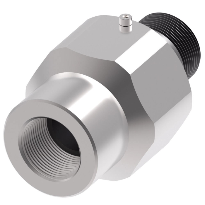 Aeroquip® Swivel Joint, FS5904 Series, Connection Type 1: NPTF, Gender 1: Female, Connection Size 1: 3/8 in, Thread Size 1: 3/8-18, Connection Type 2: NPTF, Gender 2: Male, Connection Size 2: 3/8 in, Thread Size 2: 3/8-18, Hex Size: 1.88 x 0.94 in, 5000 psi, Steel, Finish: Zinc-Plated, Dimensions: 3.62 in L x 1.88 in W x 1.88 in H, -20 to 250 deg F