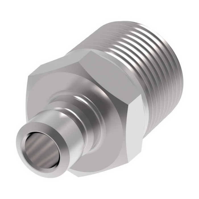 Aeroquip® Coupling Plug, Flo-Temp Series, Connection Type 1: Quick Disconnect, Gender 1: Male, Connection Size 1: 1/4 in, Connection Type 2: NPTF, Gender 2: Male, Connection Size 2: 1/4 in, Thread Size 2: 1/4-18, Hex Size: 0.84 in, 200 psi, Brass, Dimensions: 1.15 in L x 0.63 in W x 0.63 in H, -30 to 450 deg F