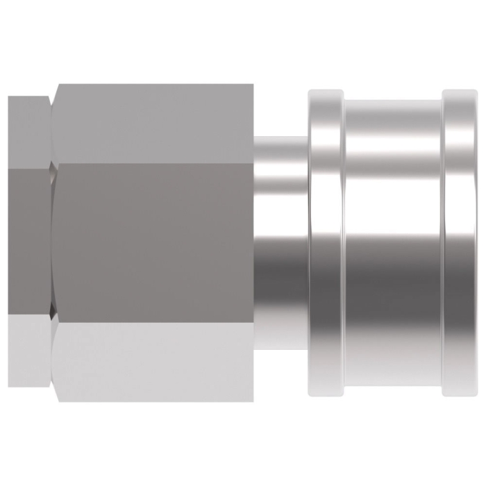 Aeroquip® Coupling, HK Series, Connection Type 1: Quick Disconnect, Gender 1: Female, Connection Size 1: 1-1/2 in, Connection Type 2: NPTF, Gender 2: Female, Connection Size 2: 1-1/2 in, Thread Size 2: 1-1/2-11-1/2, Hex Size: 2.38 in, 2175 psi, 303 Stainless Steel, Dimensions: 4.82 in L x 3.23 in W x 3.23 in H, Dimension Standards: ISO 7241-1 Series B, -40 to 250 deg F