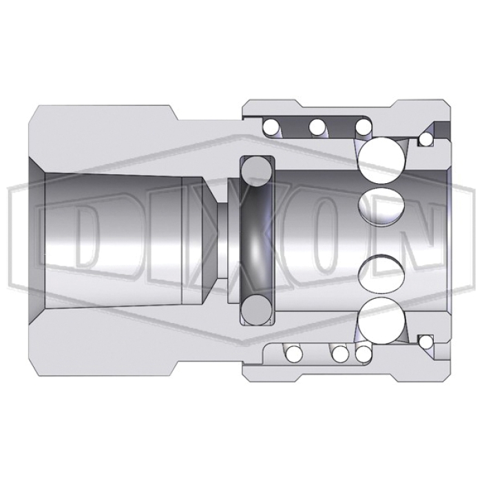 Dixon® Straight Through Interchange Coupler, E Series, Connection Type 1: Quick Disconnect, Connection Size 1: 1/2 in, Connection Type 2: NPTF, Gender 2: Female, Connection Size 2: 1/2 in, Thread Size 2: 1/2-14, Hex Size: 1-1/8 in, 3000 psi, 303 Stainless Steel, Dimensions: 1.86 in L, -40 to 250 deg F