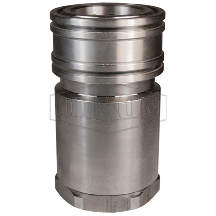 Dixon® ISO-B High-Volume Interchange Coupler, H Series, Connection Type 1: Quick Disconnect, Connection Size 1: 1-1/2 in, Connection Type 2: NPTF, Gender 2: Female, Connection Size 2: 1-1/2 in, Thread Size 2: 1-1/2-11-1/2, Hex Size: 2-5/8 in, 1500 psi, 303 Stainless Steel, Dimensions: 3 in OD x 4.81 in L, Dimension Standards: ISO 7241 Series B, -40 to 250 deg F