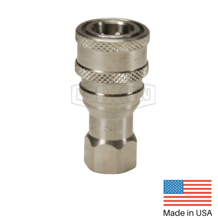Dixon® ISO-B Poppet Interchange Valve Coupler, H Series, Connection Type 1: Quick Disconnect, Connection Size 1: 1/2 in, Connection Type 2: NPTF, Gender 2: Female, Connection Size 2: 1/2 in, Thread Size 2: 1/2-14, Hex Size: 1-1/16 in, 3625 psi, 316 Stainless Steel, Dimensions: 1.86 in OD x 2.86 in L, Dimension Standards: ISO 7241 Series B, -40 to 250 deg F