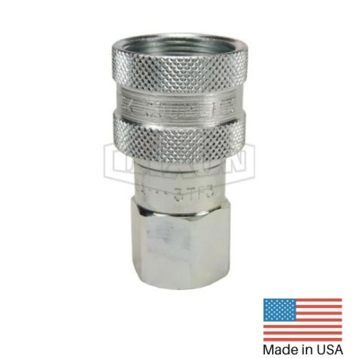 Dixon® Ball Coupler, T Series, Connection Type 1: Quick Disconnect, Connection Size 1: 3/8 in, Connection Type 2: NPTF, Gender 2: Female, Connection Size 2: 3/8 in, Thread Size 2: 3/8-18, Hex Size: 1 in, 10000 psi, Steel, Finish: Trivalent Chrome-Plated, Dimensions: 2.54 in L, -40 to 250 deg F