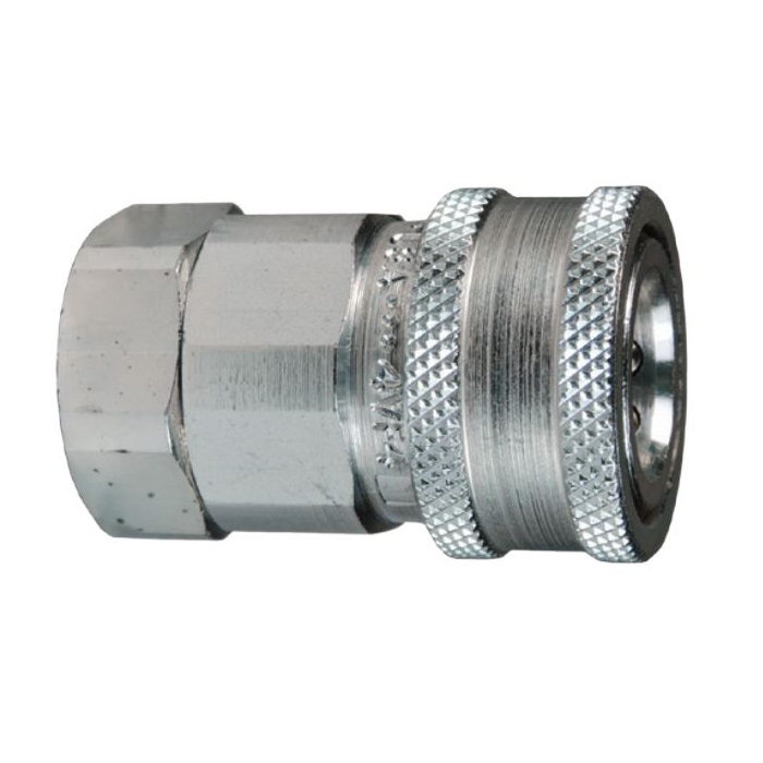 General-purpose hydraulic quick-connect provides superior flow characteristics for a variety of applications Machined components are manufactured using solid bar stock Stainless steel balls, retaining rings and spring maximize corrosion resistance and extend service life Steel componentry is plated using RoHS compliant trivalent chrome Steel coupler sleeves are hardened to resist deformation and maximize service life Tubular TV valves are constructed from steel bar stock and are designed for optimum performance in pneumatic applications Nitrile (Buna-N) seals are standard All couplers incorporate a PTFE anti-extrusion ring to protect the seal components from dynamic impulse damage Valve seals are crimped in place to maintain integrity during excessive flow conditions and pressurized connection Interchangeable to MIL-C-51234 Interchangeable with Snap-Tite H/IH Series and Faster TNV