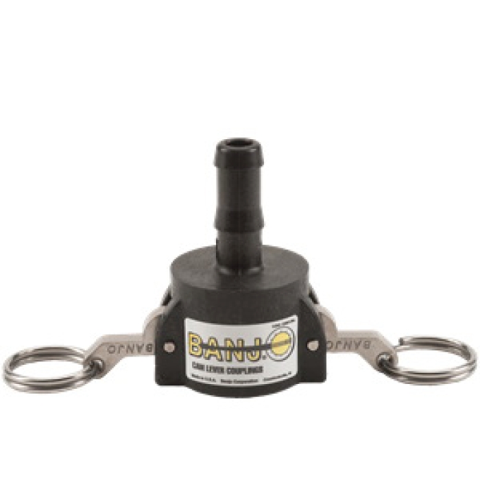 Banjo® Cam Lever Type C Coupling, Connection Type 1: Fitting, Gender 1: Female, Connection Size 1: 3/4 in, Connection Type 2: Hose Barb, Connection Size 2: 1/2 in, 300 psi, Polypropylene, Dimensions: 2-13/16 in H