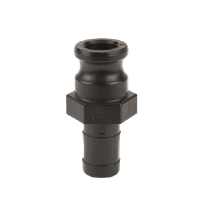 Banjo® Cam Lever Type E Coupling, Connection Type 1: Fitting, Gender 1: Male, Connection Size 1: 1 in, Connection Type 2: Hose Barb, Connection Size 2: 1 in, 300 psi, Polypropylene, Dimensions: 1-7/16 in Dia x 3-5/8 in L