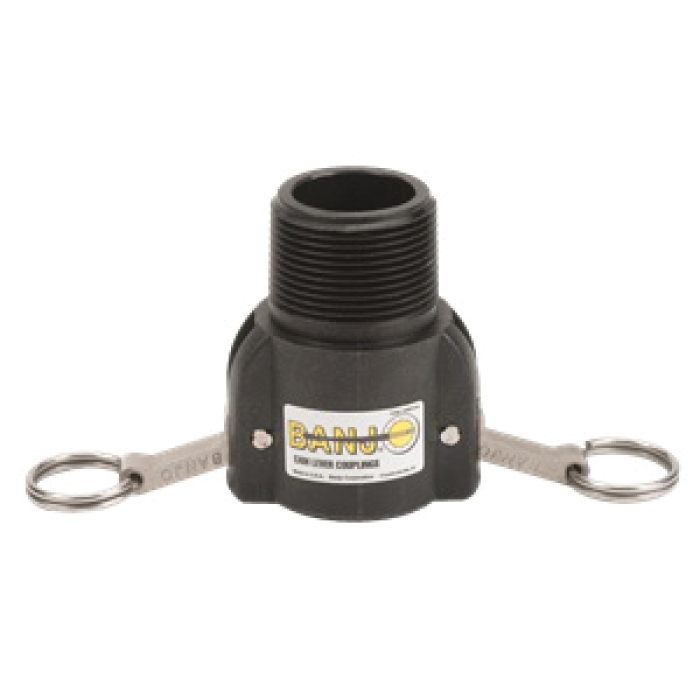 Banjo® Cam Lever Type B Coupling, Connection Type 1: Fitting, Gender 1: Female, Connection Size 1: 1 in, Connection Type 2: NPT, Gender 2: Male, Connection Size 2: 1-1/4 in, 300 psi, Polypropylene, Dimensions: 1-31/32 in Dia x 3-3/32 in L