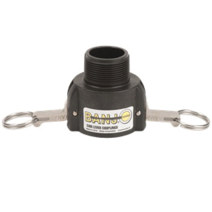 Banjo® Cam Lever Type B Coupling, Connection Type 1: Fitting, Gender 1: Female, Connection Size 1: 1-1/2 in, Connection Type 2: NPT, Gender 2: Male, Connection Size 2: 1-1/2 in, 300 psi, Polypropylene, Dimensions: 2-3/4 in Dia x 3-3/16 in L