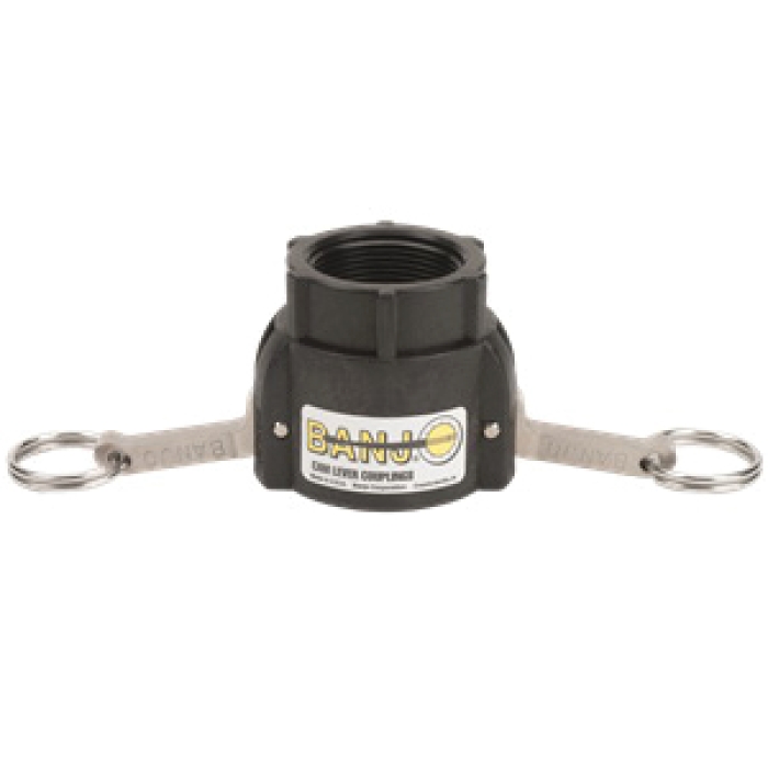 Banjo® Cam Lever Type D Coupling, Connection Type 1: Fitting, Gender 1: Female, Connection Size 1: 1-1/2 in, Connection Type 2: NPT, Gender 2: Female, Connection Size 2: 1-1/2 in, 300 psi, Glass Filled Polypropylene, Dimensions: 2-3/4 in Dia x 2-27/32 in L