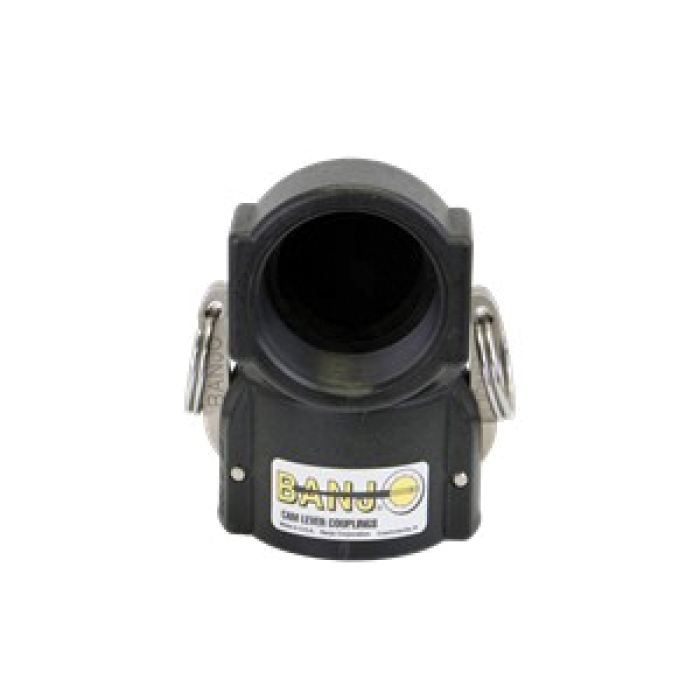 Banjo® Cam Lever Type D 90 deg Coupling, Connection Type 1: Fitting, Gender 1: Female, Connection Size 1: 2 in, Connection Type 2: NPT, Gender 2: Female, Connection Size 2: 2 in, 200 psi, Polypropylene, Dimensions: 3-1/8 in W