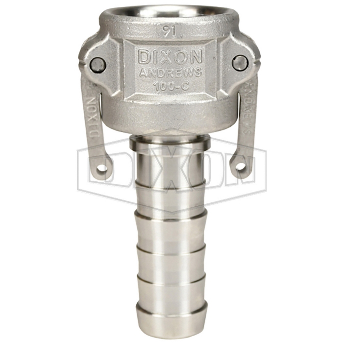Dixon® Cam and Groove Type C Coupler, Connection Type 1: Fitting, Gender 1: Female, Connection Size 1: 1 in, Connection Type 2: Hose Stem, Connection Size 2: 1 in, 250 psi, 316 Stainless Steel, Dimensions: 1-7/8 in Dia x 4-1/2 in L, For Use With: King Crimp™ Sleeves and Ferrules