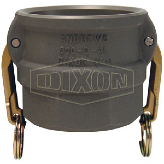Dixon® Cam and Groove Type D Coupler, Connection Type 1: Fitting, Gender 1: Female, Connection Size 1: 1-1/2 in, Connection Type 2: NPT, Gender 2: Female, Connection Size 2: 1-1/2 in, Thread Size 2: 1-1/2-11-1/2, 250 psi, Aluminum, Finish: Hard-Coated, Dimensions: 2-27/32 in L