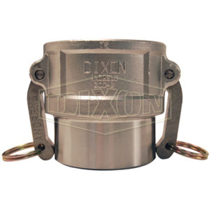 Dixon® Cam and Groove Coupler, Connection Type 1: Fitting, Gender 1: Female, Connection Size 1: 1-1/2 in, Connection Type 2: Butt Weld/Socket Weld, Connection Size 2: 1-1/2 in, 250 psi, 316 Stainless Steel, Dimensions: 2-19/32 in Dia x 2-7/8 in L, For Use With: SCH 40 Pipe or Nominal Tubing