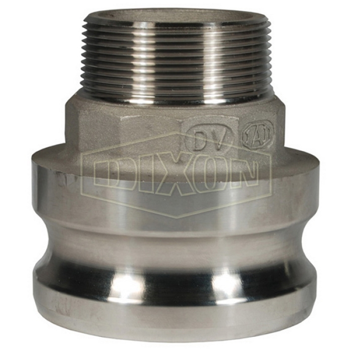 Dixon® Cam and Groove Type F Reducing Coupler, Connection Type 1: Fitting, Gender 1: Male, Connection Size 1: 2 in, Connection Type 2: NPT, Gender 2: Male, Connection Size 2: 1-1/2 in, Thread Size 2: 1-1/2-11-1/2, Hex Size: 2-1/4 in, 250 psi, 316 Stainless Steel, Dimensions: 2-31/64 in Dia x 3-7/8 in L