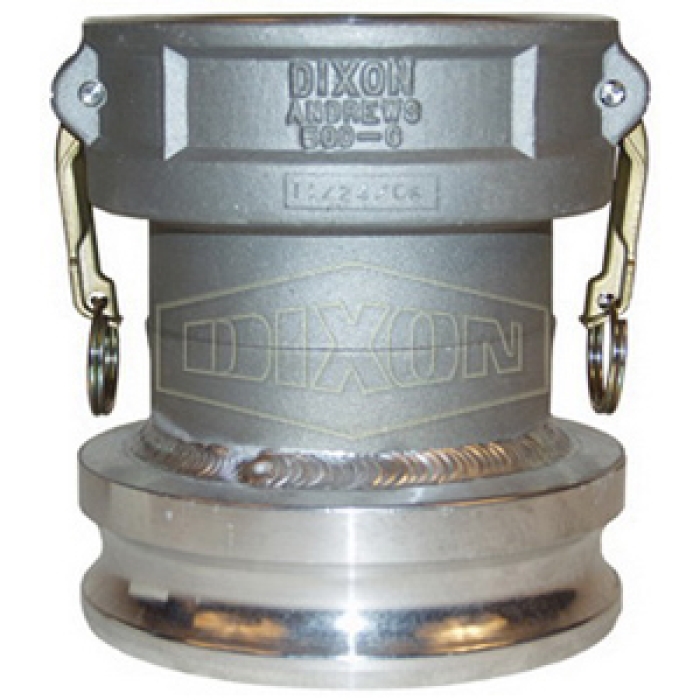 Dixon® Cam and Groove Type DA Jump Size Coupling, Connection Type 1: Fitting, Gender 1: Female, Connection Size 1: 2 in, Connection Type 2: Fitting, Gender 2: Male, Connection Size 2: 2-1/2 in, 150 psi, Aluminum, Dimensions: 3-11/16 in Dia x 5-3/4 in L