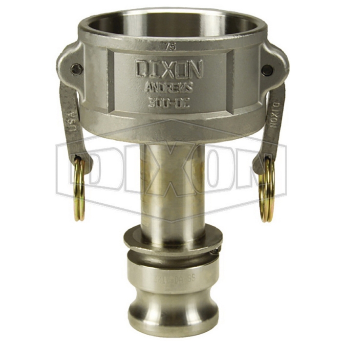 Dixon® Cam and Groove Type DA Jump Size Coupling, Connection Type 1: Fitting, Gender 1: Female, Connection Size 1: 3 in, Connection Type 2: Fitting, Gender 2: Male, Connection Size 2: 1-1/2 in, 125 psi, 316 Stainless Steel