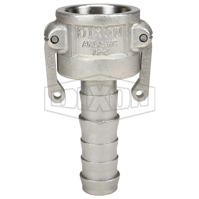 Dixon® Cam and Groove Type C Coupler, Connection Type 1: Fitting, Gender 1: Female, Connection Size 1: 3/4 in, Connection Type 2: Hose Stem, Connection Size 2: 3/4 in, 250 psi, 316 Stainless Steel, Dimensions: 1-5/8 in Dia x 3-11/16 in L, For Use With: King Crimp™ Sleeves and Ferrules